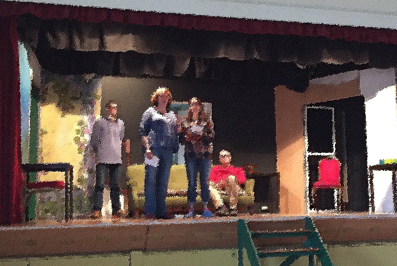 This sneaked sketch by a covert artist shows members of the cast rehearsing “at a location somewhere in Devon” for the SBADS forthcoming comedy “whodunit”, Death by Design. Performances are in the evenings of 18, 19 and 20 May and tickets will be on sale from 8 May.